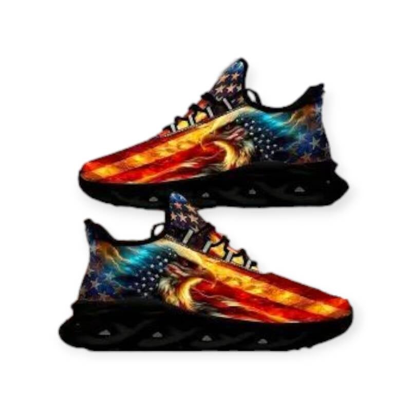 * Obermaterial: Das Obermaterial ist mit einem hochauflösenden, farbenfrohen Druck versehen, der eine amerikanische Flagge darstellt. In der Mitte der Flagge ist ein majestätischer Weißkopfseeadler mit ausgebreiteten Schwingen zu sehen.
