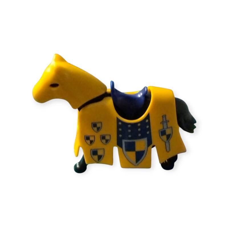 Dieses charmante Playmobil Pferd ist ein ideales Ersatzteil für Ihre Ritterburg oder Mittelalter-Spielwelt. Das Pferd ist mit einer detaillierten Rüstung in den Farben Gelb und Blau ausgestattet, die ein Wappen mit einem Schachbrettmuster und weiteren heraldischen Symbolen zeigt. Es verfügt zudem über einen blauen Sattel.